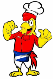 The mark consists of image of standing chicken outlined in black wearing a chefs hat in the color white with a red shirt black line in the center with three yellow buttons on the right. The chicken has a beak, red comb on his head and red wattle on the bottom of the beak with white eyes and black pupils. The bottom of the chicken is shown in white with a blue apron, white line with five dots, a red tail and yellow feet. The chicken has both arms pointing at himself.