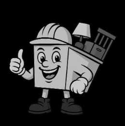 The mark consists of Yellow cartoon box character with a construction hard hat. Smiling face Thumbs up Work boots Arms and legs Carrying furniture Lamp Chair Dresser Mascot style illustration.