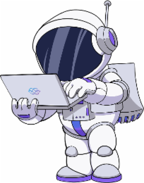 The mark consists of an astronaut suit holding a computer laptop. The astronaut suit has features in white, purple, grey, and black while the computer laptop is grey with a design on a lid of the laptop in blue and purple.