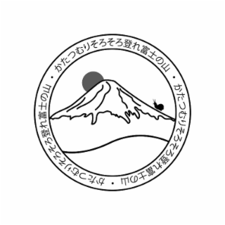 The mark consists of a circular design containing an outline drawing of Mount Fuji with a sun above the peak and a silhouette of a snail on the right slope of the mountain. Surrounding the mountain scene is a circular border with Japanese characters repeated around it that translate to “Snail, slowly, slowly climb Mount Fuji”.