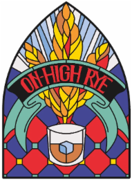 The mark consists of a stylized stained-glass window design with an overall shape of a square bottom and pointed top, surrounded by a thick black outline with all designs contained in the shape outlined in black. Inside the stained glass design, there is a green banner with the stylized wording ON-HIGH RYE in red on the banner with a black background. Behind the ribbon design are three stylized stalks of wheat in yellow, orange, dark orange, and red. Below the stalks of wheat and ribbon design is a stylized white glass containing brown whiskey with a light blue and dark blue ice cube in the center of the bottom of the glass. The bottom portion of the design is a background pattern of red and dark blue diamond tiles separated by green and yellow squares and the top portion of the design, above the ribbon banner design, are dark blue, light blue, and white stripes. The remaining white represents background, outlining, shading, and/or transparent areas and is not part of the mark.