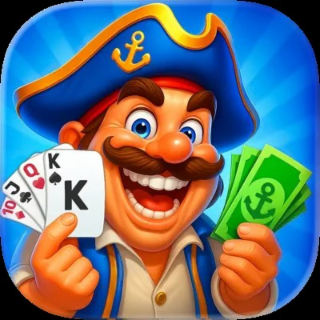 The mark consists of A grinning male cartoon character with a brown mustache and eyebrows in a blue background; he wears a white shirt, a blue-and-yellow vest, and a blue pirate hat with a yellow brim; he also holds four white poker cards in his right hand and green currency with a green anchor in his left hand; both his hat and the paper currency feature an anchor design.