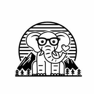 The mark consists of a stylized elephant wearing eyeglasses, facing forward. The elephant’s trunk curves upward and ends adjacent to a heart shape. Behind the elephant is a circular background comprised of horizontal lines. Stylized mountain shapes appear on each side of the elephant within the circular background. At the base of the design are multiple stylized evergreen trees.