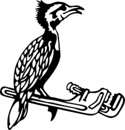 The mark consists of a stylized depiction of a bird perched on a pipe wrench.