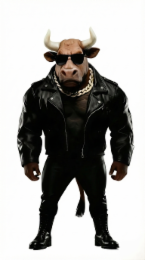 The mark consists of an anthropomorphic bull image, a black leather jacket design, thick metal chain decorations, black sunglasses, and matching black leggings and leather boots.