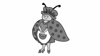 The mark consists of A smiling cartoon female figure with eyebrows and the eyes are looking right. She is wearing a hat with ruffles along the brim of the hat and darker detail on top of the ruffles along the body of the hat. There are two antennae protruding upwards and angled left and right with thicker tips on the end on top of the hat ruffles. She is wearing a necklace with wings coming out of her shoulders with darker spots along the wings. Her dress is short and short-sleeved. She has a lighter colored apron around her waist with various sized semi-circles ruffles on the outside. Her arms are angled inwards with her two hands placed inside a darker pocket with similar semi-circle ruffle along the top of the pocket that is placed in the middle of the apron. Her right leg is angled right with a high heel shoe with a bow on her right foot; her left leg is facing forward, showing the front part of a shoe with a bow.