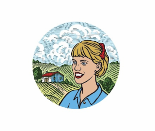 The mark consists of a woman with beige skin outlined in black, blue eyes with black pupils and black eyebrows, smiling red lips outlined black with white teeth, and golden hair tied with a red ribbon outlined in black, wearing a blue collared shirt with a beige button, both outlined in black, in the foreground of a landscape with blue sky, white clouds, rolling green hills with green trees and a beige road, and a white and blue structure with red roof, brown doors, and two windows and a chimney, all encased in a circle with black lines resembling pencil strokes dispersed throughout.